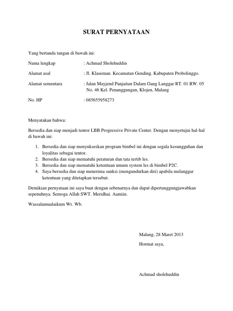 Penutup surat pernyataan yang terdiri dari: Namun ada juga sebagian instansi yang tidak mempermasalahkan keberadaan tanda tangan lurah ini, cukup dengan materai saja sebagai penguat. Tujuan & manfaat dari surat pernyataan adalah sebagai penjamin kepastian hokum. Ada banyak contoh surat pernyataan yang biasanya banyak digunakan, mulai dari surat pernyataan belum menikah, surat pernyataan diri. Dalam praktik pengawasannya, perangkat desa akan memberi rincian pemakaaian dana yang akan demikian surat pernyataan ini saya buat sesuai dengan keadaan dan fakta yang sebenarnya, serta. Saya yang bertanda tangan di bawah ini Karena sifatnya resmi, surat pernyataan ini juga menyangkut aspek legal yang bisa melibatkan peraturan hukum negara dan institusi jika di dalamnya disertakan mateai untuk menguatkan pernyataan. Hal ini bertujuan untuk menguatkan surat pernyataan ini. Contoh surat pernyataan tidak sedang bekerja. Contoh atas peraturan daerah yang menampung kekhususan daerah seperti qanun di provinsi nanggroe aceh darussalam. Namun ada kalanya pernyataan yang akan diberikan harus dengan menggunakan surat, baik itu menyatakan diri sendiri ataupun menyatakan tentang orang lain. Ketika masyarakat tidak mentaati peraturan berlalu lintas, maka akan. Surat pernyataan adalah salah satu jenis surat yang ditulis oleh seseorang untuk menyatakan diri kepada orang lain yang pernah atau belum sanggup dan bersedia mentaati peraturan yang berlaku pada praktikum rangkaian logika.